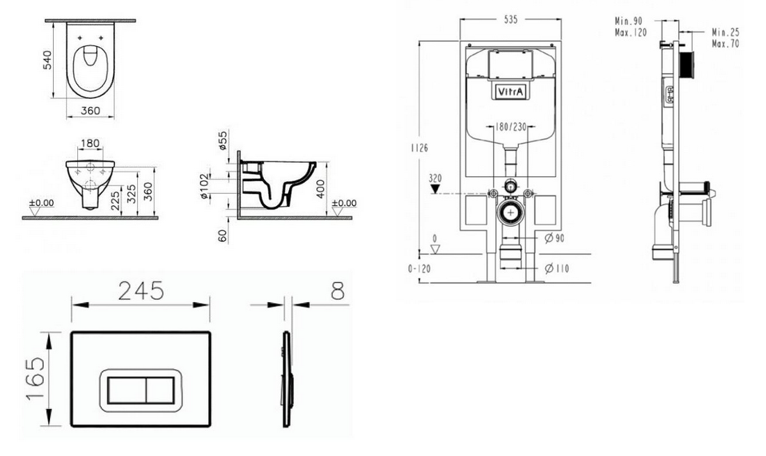 Готовое решение от Vitra 9812B003-7209: Инсталляция, подвесной унитаз и кнопка смыва в одном комплекте.