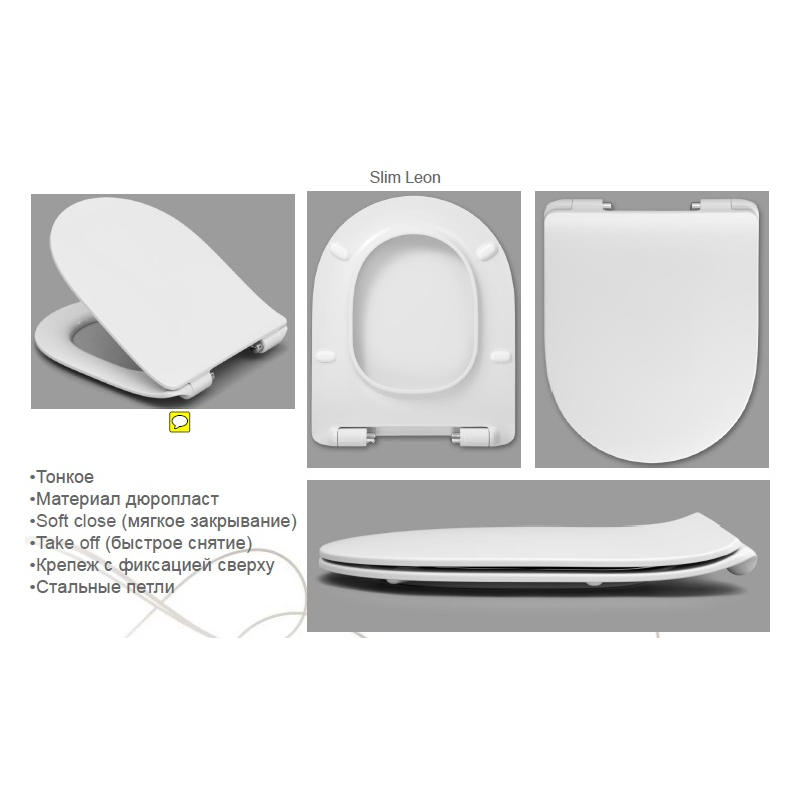 Сиденье для унитаза Leon. Roca с микролифтом Тонкое Soft close (мягкое закрывание) Take off (быстрое снятие) Крепеж с фиксацией сверху Стальные петли Габариты (дшв): 42 x 37.5 x 3
