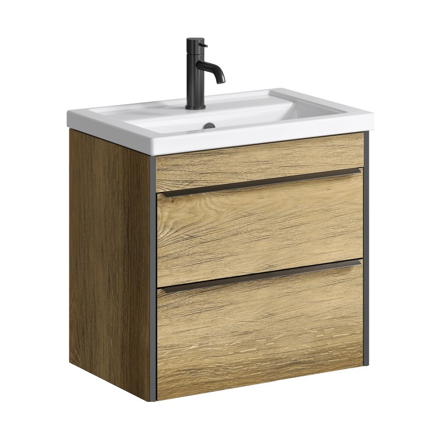 Фасады и корпус тумбы Fargo выполнены из ЛДСП (древесностружечной плиты повышенной плотности) в цвете дуб балтийский, кромка матового черного цвета.