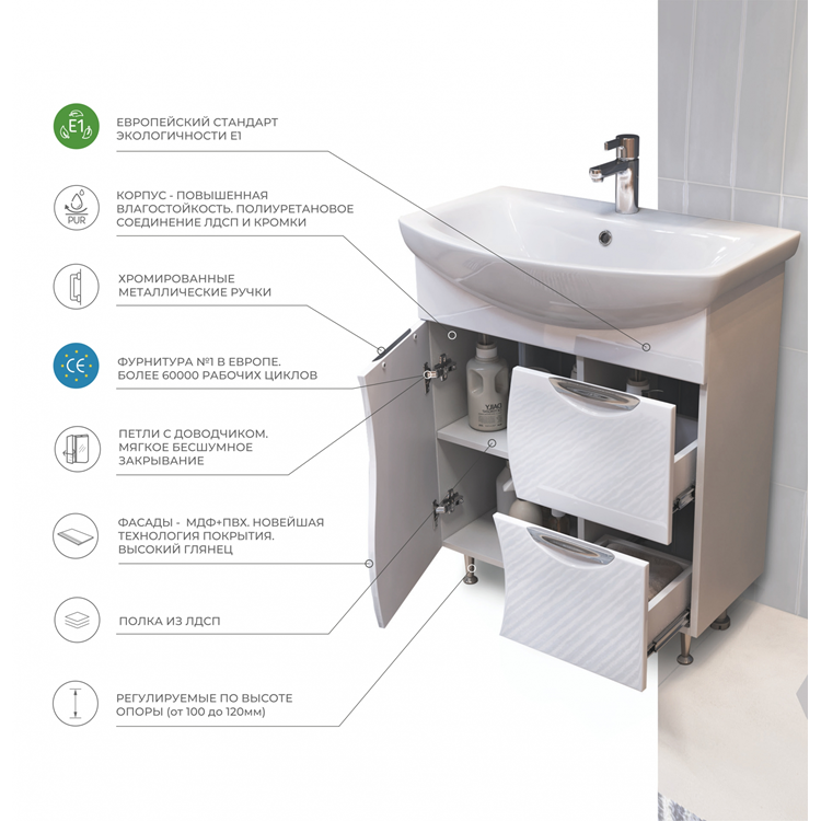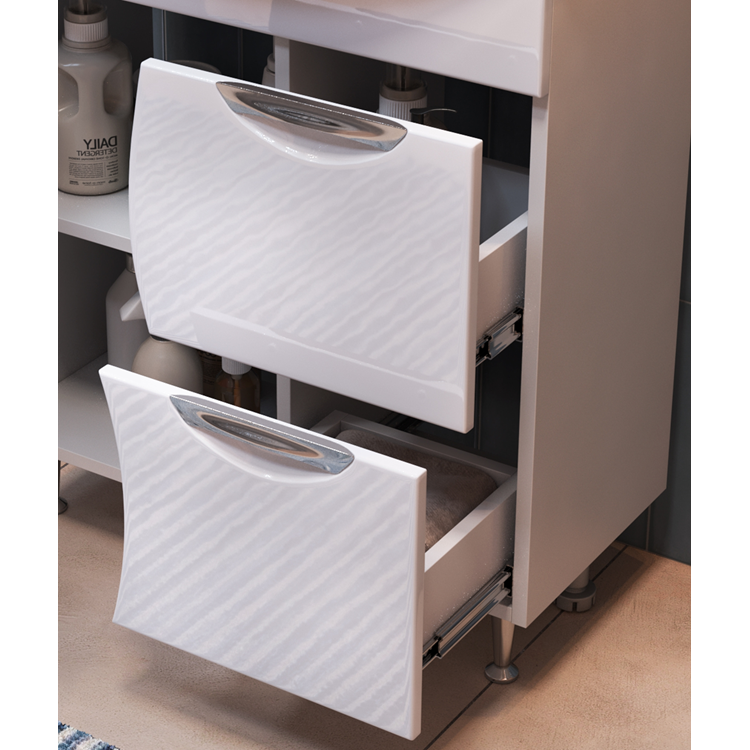 Оснащение: 1 дверца; 2 ящика; 1 полка ЛДСП; ручка металлическая хромированная; опоры конус регулируемые