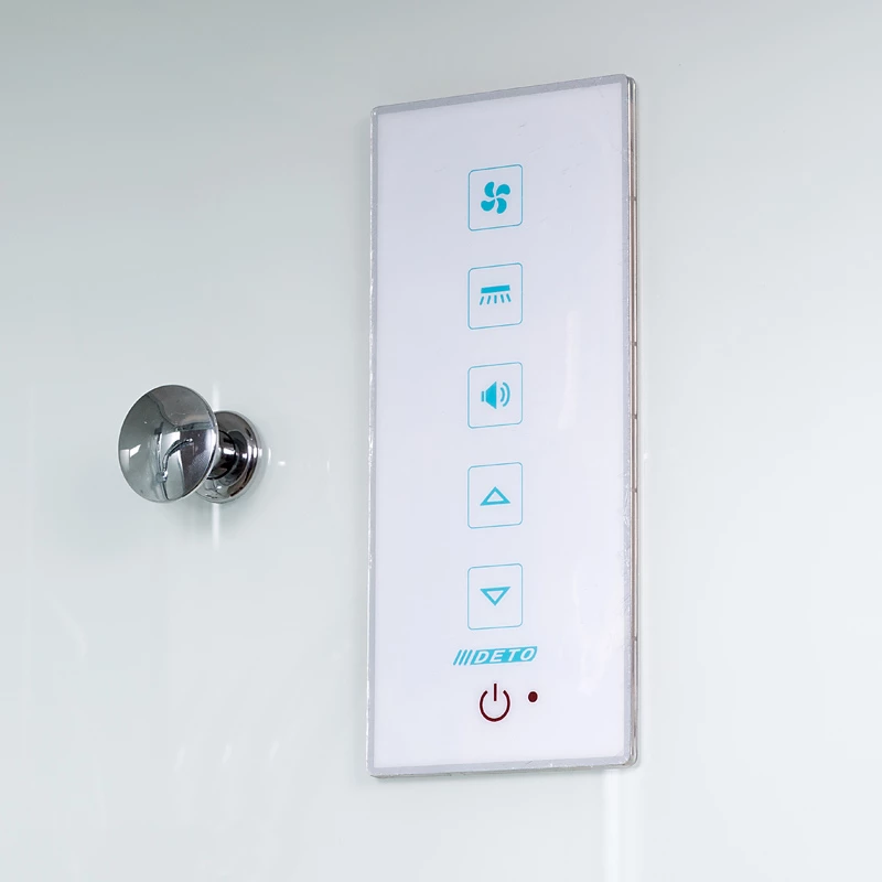 Бессиликоновая сборка Резьбовые соединения Металические (верхние и нижние) саморегулирующиеся безопасные ролики в пластиковом антикоррозийном кожухе Армированный акриловый поддон на металлическом каркасе Антискользящее покрытие Задние стенки изготовлены из белого ударопрочного стекла толщиной 4 мм Переднее матовое закаленное стекло толщиной 4 мм Алюминиевый глянцевый профиль Латунный смеситель и переключатель режимов Полочка с ограничителем Зеркало Верхняя лейка (тропический дождь) Крыша Штанга для регулирование высоты ручной лейки Ручная лейка d 140 мм Высота поддона 15 см Деревянная влагостойкая вставка ( обработана при t 250C) Сифон с гидрозатвором Сенсорный пульт управления Led лента в световых панелях Вентиляция Радио