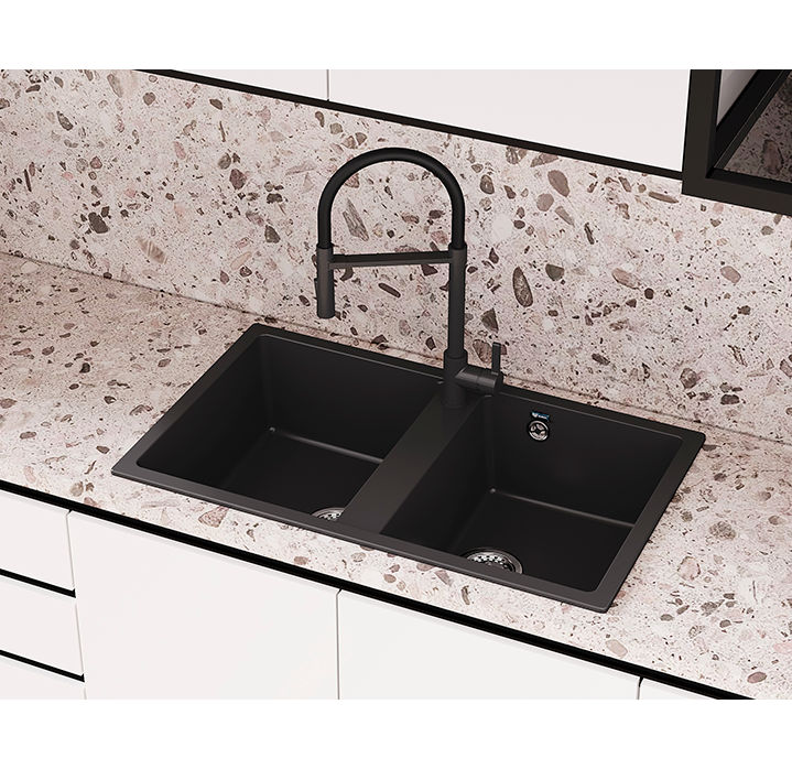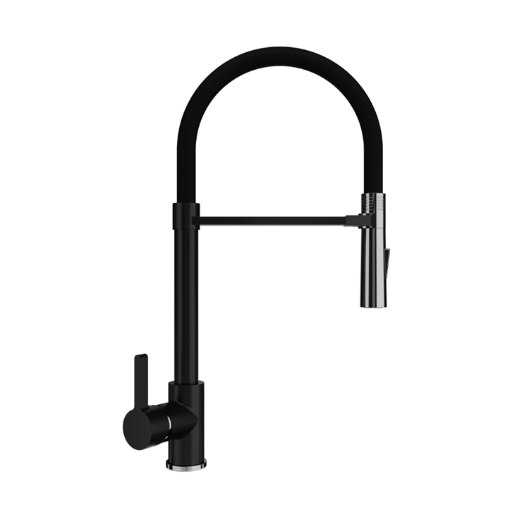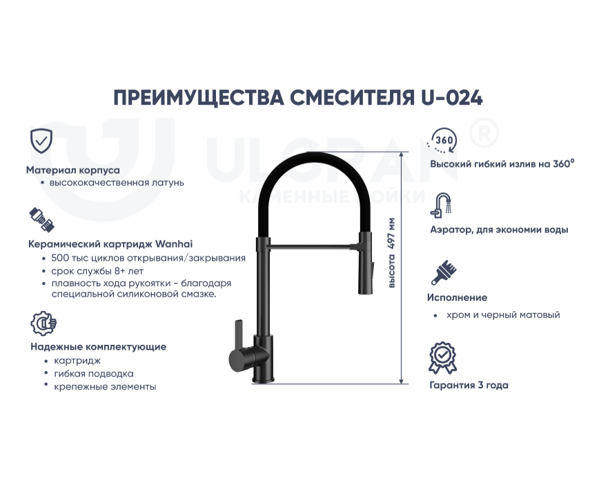 ULGRAN U-024 - стильный современный кухонный смеситель с высоким гибким изливом черного цвета. Материал корпуса выполнен из высококачественной латуни, а окрашивание под "искусственный камень", в цвет мойки ULGRAN выполняется на собственном производстве, что позволяет идеально попасть в фирменный цвет моек ULGRAN.