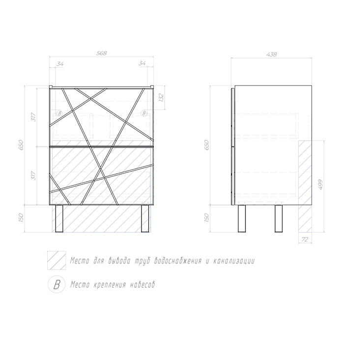Оснащение: 2 выдвижных ящика, направляющие скрытого монтажа, открывание нажатием "push-to-open", 2 навеса, 2 опоры квадратные регулируемые