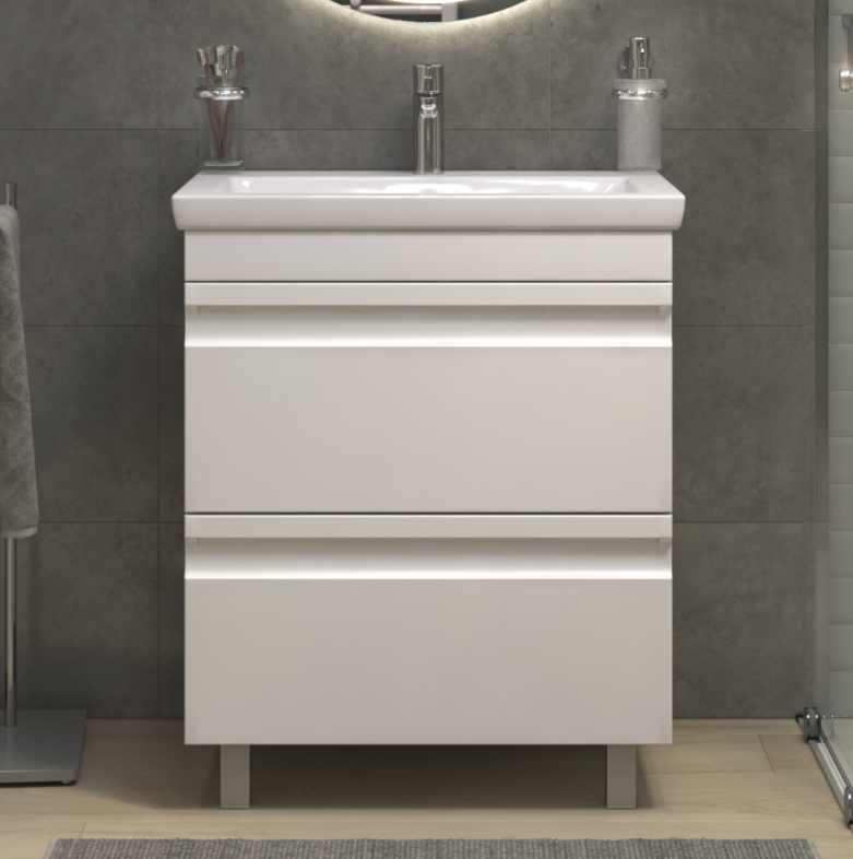Тип установки напольная Материал корпуса влагостойкая ЛДСП Покрытие корпуса ламинат Материал фасада ЛМДФ Покрытие фасада матовая пленка ПВХ Фурнитура шариковые направляющие полного выдвижения Лицевая фурнитура интегрированные ручки Механизм доводчика нет Нажимной механизм открывания (push-to-open) нет Оснащение 2 выдвижных ящика, шариковые направляющие полного выдвижения, 2 опоры квадратные регулируемые, 1 сифон