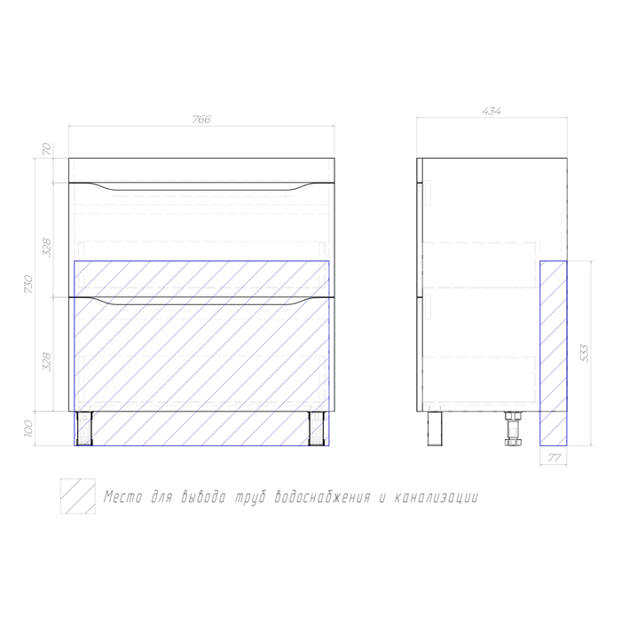Оснащение: 2 ящика, выдвижной органайзер для мелочей, шариковые направляющие полного выдвижения, 2 опоры квадратные регулируемые; 2 кухонные опоры, 1 сифон