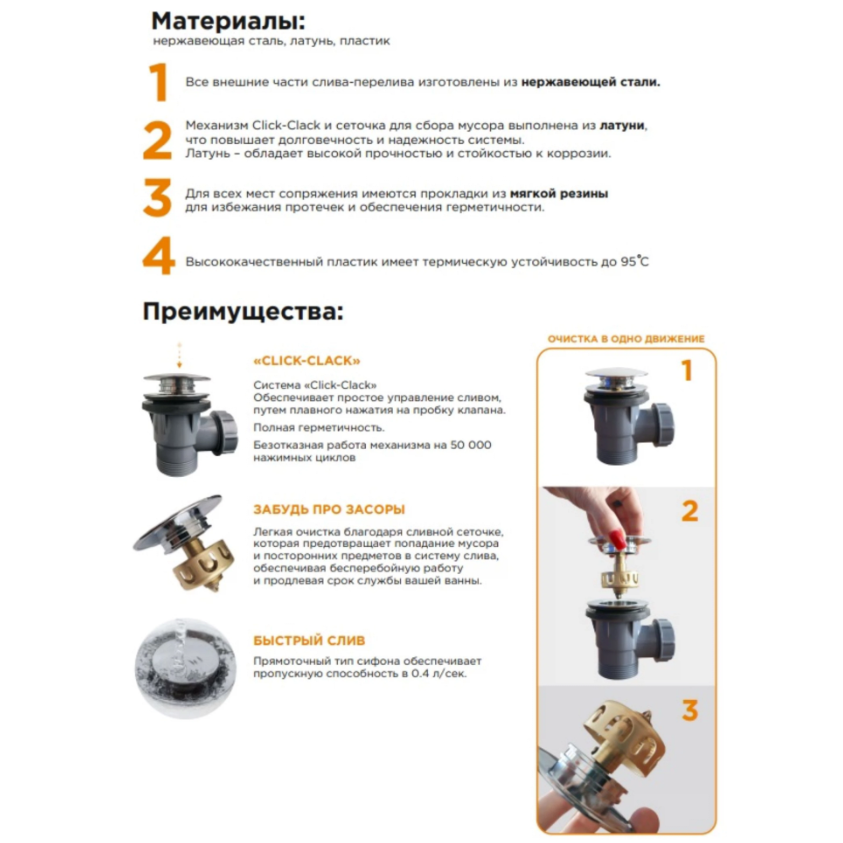 Цвет: черный – стильный и современный вариант, который легко впишется в любой интерьер. Материал: пластик и металл – прочные и долговечные материалы, устойчивые к коррозии и воздействию химических веществ. Сифон: входит в комплект, что позволяет сразу установить систему без дополнительных покупок. Сеточка: предотвращает попадание крупных предметов в сливное отверстие, защищая систему от засорений. Этот слив-перелив станет отличным выбором для тех, кто ценит функциональность, стиль и удобство в использовании.