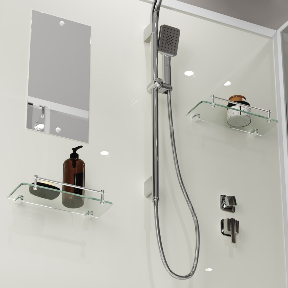 • Смеситель из латуни на 2 режима с долговечным керамическим картриджем • Верхний душ (тропический) с системой защиты от накипи • Ручной душ, гибкий шланг, зеркало, штанга-держатель, две удобные полочки